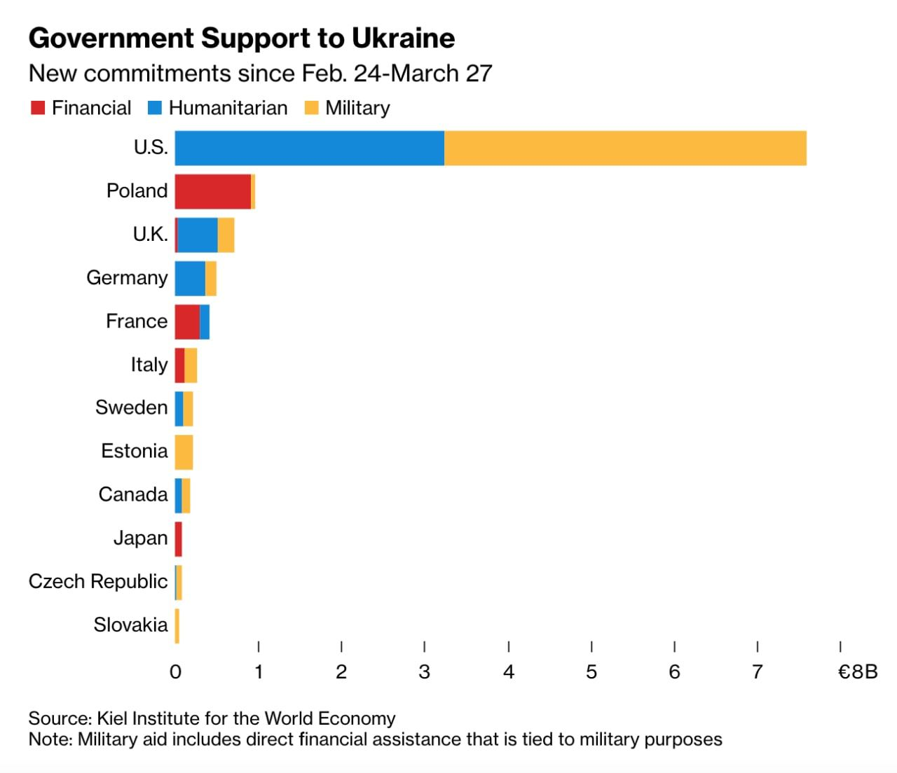 Допомога, надана Україні з 24.02 по 27.03.22 р. у млрд євро: