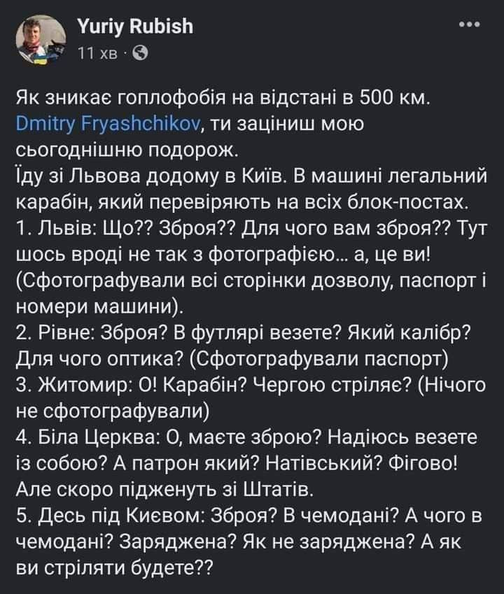 як заїзджав в Луцьк через блок пост на трасі ( бо потім їздив іншим шляхом), то разом з паспортом показав дозвіл на зброю, перевірили, звірили номер на рушниці (возив з собою) з вписаним в дозвіл, зауважили, що заряджена (рушниця помпова). Відповів - а нафіг вона мені тоді треба розряджена, час такий, тому й заряджена. Розуміюче покивали й відпустили